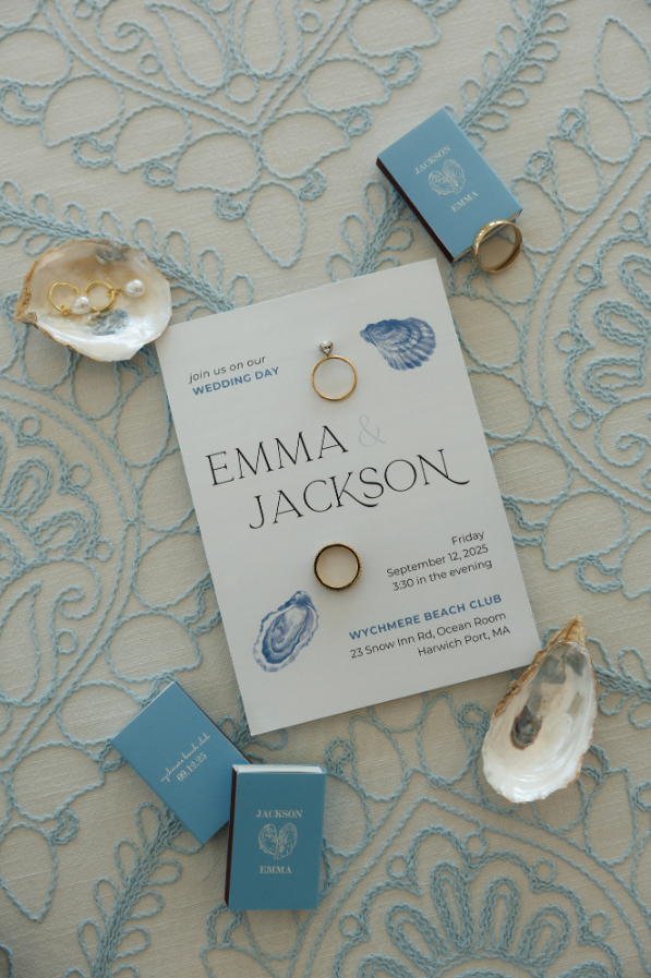 Custom watercolor oyster illustrations added just the right amount of personality. Playful yet polished, and entirely unique to Emma & Jackson. What started as a subtle design element quickly became the thread that tied everything together, appearing across pieces to add texture, charm, and a sense of place that felt distinctly Cape Cod.