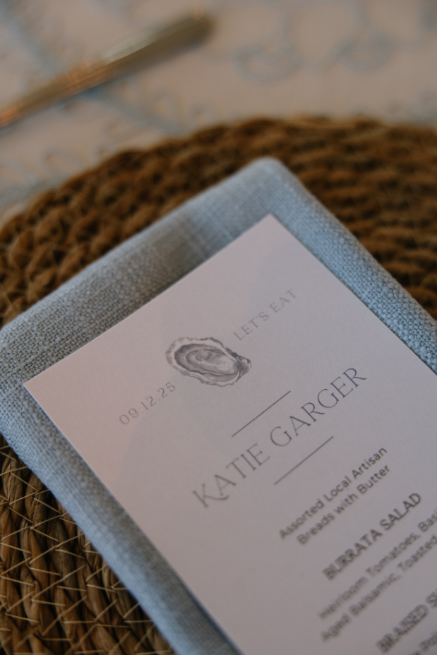 From day-of moments to the smallest finishing touches, this wedding leaned into its coastal theme in a way that felt thoughtful and elevated. The oyster illustrations carried through, popping up in all the right places and bringing a sense of continuity—and a nautical nod—to the entire experience.