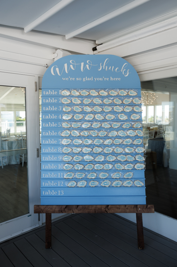 The couple had envisioned an escort display with oyster shells, but between the cost (and the ironic twist that they’re actually allergic to oysters), the idea needed a bit more massaging.